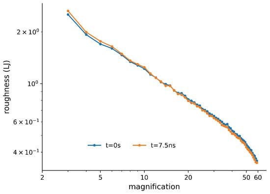 Roughness versus magnification when the compression was stopped at a strain of . The blue curve corresponds to the moment when the compression was stopped, while the orange curve was after 7.5 ns of relaxation. There are changes in the roughness at both high and low magnification.