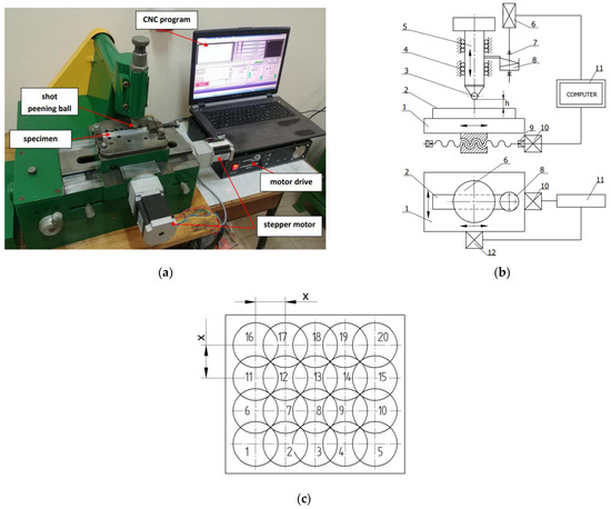 Originally designed impulse shot peening stand (a), schema of a stand for impulse shot peening (b) 1—CNC table, 2—workpiece, 3—ball, 4—ball guides, 5—beater, 6—engine, 7—shaft, 8—cam, 9—guide screw, 10—stepper motor, 11—computer, 12—stepper motor, and scheme of indentations on the peened surface (c).