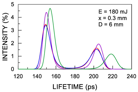 The preliminary analysis of the PALS measurement results was carried out with the use of the MELT software (Université de Genève, Genève, Switzerland) [37]. It revealed the presence of two dominant components in the spectra, but this method of analysis yields large statistical dispersions (Figure 3). The main analysis of the data performed using the PALSfit program (Technical University of Denmark, Roskilde, Denmark) [38] showed that, in addition to these components, it is necessary to assume the existence of a long-life component with a lifetime of approx. 1.75 ns and a negligible intensity of <0.2% in order to obtain a good fit. This was necessary due to the very low background level (approx. 35 counts/channel at 8000 channels covering a timebase of 50 ns). During the analysis, a correction nt for annihilation in the source envelope with a lifetime of 382 ps and a contribution of 14.44% determined in the Positron Fraction program [39] was assumed. The resolution curve was approximated by a single Gaussian with FWHM ≈ 206 ps.