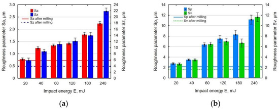 Figure 4 shows the effect of the impact energy on the analyzed 3D surface roughness parameters. The increase in the impact energy was accompanied by a clear rise Sa (arithmetical mean height of the surface), Sz (maximum height of the surface) (Figure 4a), Sp (maximum peak height of the surface), and Sv (maximum pit height of the surface) (Figure 4b). This is related to the formation of deeper depressions on the shot-peened surface. The application of high impact energies caused substantial deformations of post-milling micro-roughness (increased value of the Sp) and formation of numerous depressions (increased Sv). In terms of the impact energy used in the experiment, the analyzed parameters of the 3D surface roughness increased in comparison with these values obtained after the milling process.