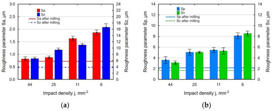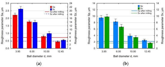 In the process of impulse shot peening with the use of a ball with a small diameter, the contact surface of the ball with the workpiece is relatively small, hence the more intense plastic-elastic deformations result in an increase in surface roughness. In turn, the impact of a ball with a larger diameter produced shallower indentations on the surface, which caused more intensive micro-roughness smoothing after milling and a decrease in surface roughness parameters Sa, Sz, Sp, and Sv (Figure 6). At a ball diameter of d = 12.45 mm, the analyzed parameters of 3D surface roughness reached the values similar or lower than those obtained for the milled surface.