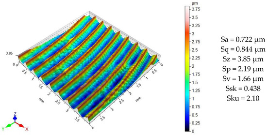 Figure 7 shows the topography and 3D surface roughness parameters prior to impulse shot peening. The surface topography after milling was characterized by an even distribution of micro-roughness with clearly visible elevations and depressions resulting from the geometric-kinematic mapping of the tool in the workpiece. The elevations and depressions represent similar proportions in the total surface profile. The surface topography should be classified as a directed structure.
