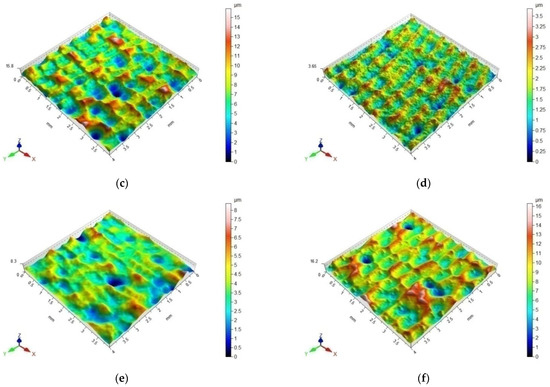 Topography of the surface of Inconel 718 samples after impulse shot peening: (a) E = 20 mJ, d = 6.00 mm, j = 11 mm−2; (Sa = 1.05 µm Sz = 9.39 µm Sp = 4.89 µm, Sv = 4.50 µm, Ssk = 0.059), (b) E = 240 mJ, d= 6.00 mm, j = 11 mm−2; (Sa = 2.44 µm Sz = 23.30 µm Sp = 11.40 µm, Sv = 11.90 µm, Ssk = 0.202), (c) E = 180 mJ, d= 3.95 mm, j = 11 mm−2; (Sa = 1.80 µm Sz = 15.90 µm Sp = 8.47 µm, Sv = 7.45 µm, Ssk = 0.258), (d) E = 180 mJ, d = 12.45 mm, j = 11 mm−2; (Sa = 0.41 µm Sz = 3.68 µm Sp = 1.96 µm, Sv = 1.73 µm, Ssk = 0.166), (e) E =40 mJ d = 10 mm, j = 44 mm−2; (Sa = 0.76 µm Sz = 8.38 µm Sp = 4.82 µm, Sv = 3.58 µm, Ssk = 0.135), (f) E = 40 mJ, d = 10 mm, j = 6 mm−2; (Sa = 1.90 µm Sz = 16.30 µm Sp = 7.69 µm, Sv = 8.62 µm, Ssk = 0,092).