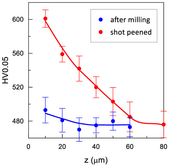 The impulse shot peening process resulted in changes in the surface microhardness (Figure 9). Impulse shot peening contributed to growth in the density of dislocations, which propagated and were halted when they encountered other dislocations, grain boundaries, or precipitates. The “blockage” of the arising dislocations contributed to an increase in the microhardness parameters. The increase in microhardness close to the surface ranged from 27 HV 0.05 to 108 HV 0.05, and the maximum changes in microhardness reached the depth from 0.04 mm to 0.08 mm.