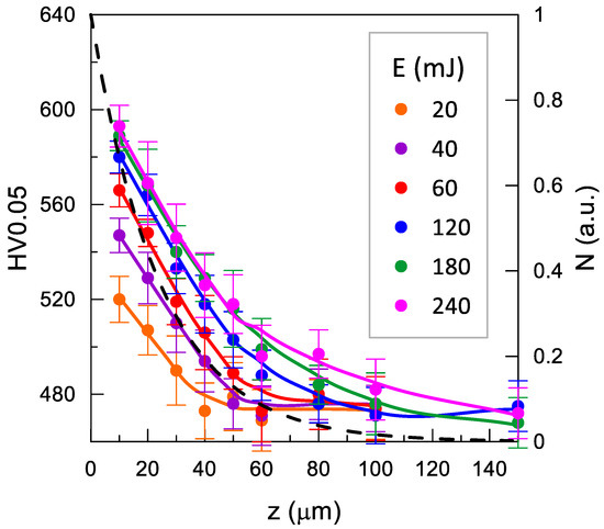 Effect of impact energy E on microhardness distribution (j = 11 mm−2, d = 6.00 mm). The dashed line shows the positron implantation profile (N); the solid lines are only an eye-guide.