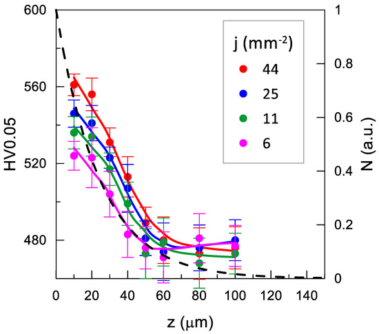 Effect of shot peening density j on microhardness distribution (E = 40 mJ, d = 10 mm). The dashed line shows the positron implantation profile (N); the solid lines are only an eye-guide.