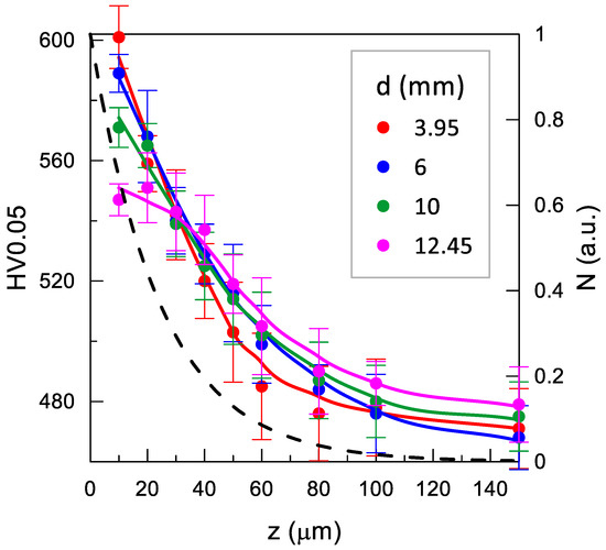 An increase in the diameter of the shot peening ball d contributed to enlargement of the impact-induced indentation surface area. This led to reduction of the concentration of energy transferred to the workpiece, thereby lowering the microhardness of the surface layer of the Inconel 718 samples (Figure 12). Noteworthy, while approximately parallel shifts of microhardness distributions with a similar slope were observed in the case of changes in E and j, the distributions became flatter with the increase in d. This indicates that the increase in the ball diameter is accompanied by a decrease in the microhardness at the surface and the rise in the depth of the surface layer hardening.