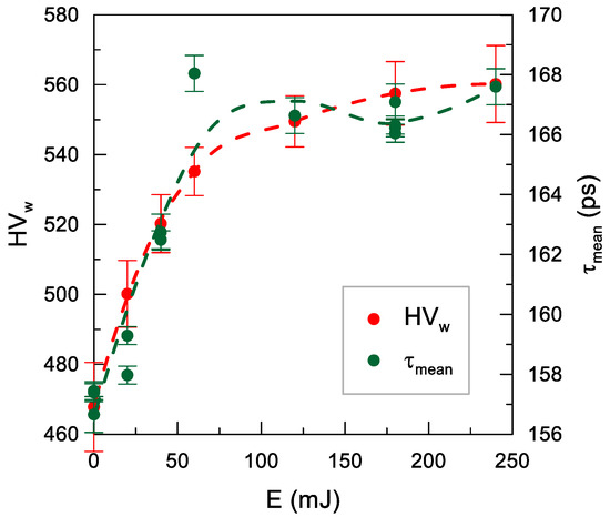 The comparison of τmean and HVw for different impact energy values is shown in Figure 13. In the untreated sample, τmean ≈ 157 ps corresponded to HVw ≈ 470. The growth in the impact energy to 60 mJ was accompanied by an approximately linear increase to τmean ≈ 168 ps and HVw ≈ 540. This evidences an increase in the concentration of point defects. Importantly, τmean indicates the ratio of defects to dislocations; nevertheless, a decrease in the concentration of dislocations caused by the shot peening seems unlikely. In turn, changes in their structure cannot be excluded, i.e., the dislocations became shorter, which resulted in faster de-trapping of positrons propagating along the dislocation line and trapping in point defects often accompanying dislocations [47]. Above energy of 60 mJ, τmean had a constant value within measurement errors, and the increase in the HVw value was inconsiderable. This indicates saturation of the alterations in the samples. The upper sensitivity limit for PALS is known, i.e., the absence of an increase in the mean lifetime despite an increase in the defect concentration when all positrons are trapped in a given type of defect. However, the absence of an increase in HVw suggests that this was not the case here.