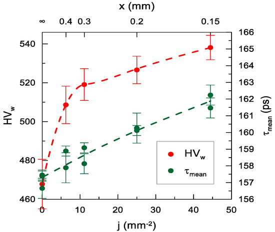 Dependence of the weighted mean of microhardness HVw and the mean positron lifetime τmean on the peening density j (E = 40 mJ, d = 10.00 mm). The dashed lines are only an eye-guide.