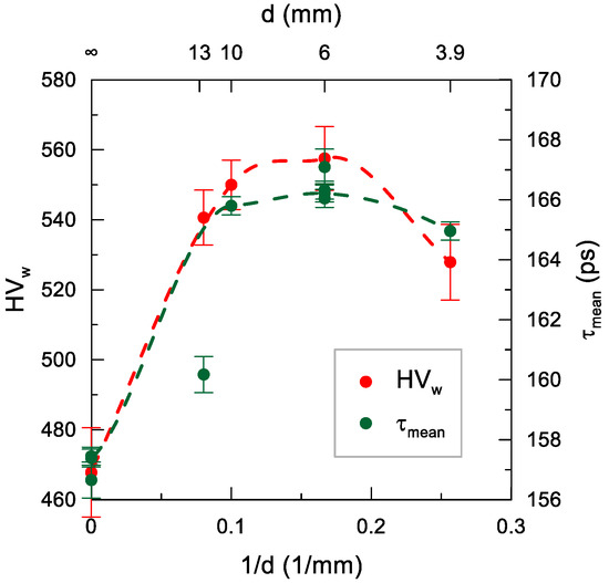 Dependence of the weighted mean of microhardness HVw and the mean positron lifetime τmean on the ball diameter d (E = 180 mJ, j = 11 mm−2). The dashed lines are only an eye-guide.