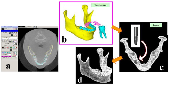 Moreover, with a wide range of implants currently in clinical use, it is difficult to select the type of implant best suited to the individual needs of the patient. At present, in the absence of any clear selection criteria for implants, selection is almost always made on the basis of the clinician’s experience with mandibular bone size and previous clinical outcomes. For this reason, three-dimensional visualization techniques using dental X-ray computed tomography (CT) scanning devices have become effective methods of examination for making accurate diagnoses [8,9,10,11]. Three-dimensional X-ray CT devices are able to measure the bone morphology and density of live individuals. It has been reported that these data can be used to produce 3D finite element (FE) models that reproduce with a high degree of precision the detailed morphology of the bone as well as material properties that accurately reflect the internal structure of the bone [12,13,14,15]. Stress analysis calculated by FE method showed an excellent distribution of bone around implant while any forces applied. Some articles provided stress distribution any type of implant [16,17,18]. If it were possible to perform virtual implant therapy simulations using 3D X-ray CT scans of live individuals prior to the actual procedure, treatment planning for implants could be carried out with a high level of mechanical predictability, which could become a new diagnostic standard in clinical practice. This would contribute to highly safe and successful implant therapy, from examination and diagnosis to planning and surgery.