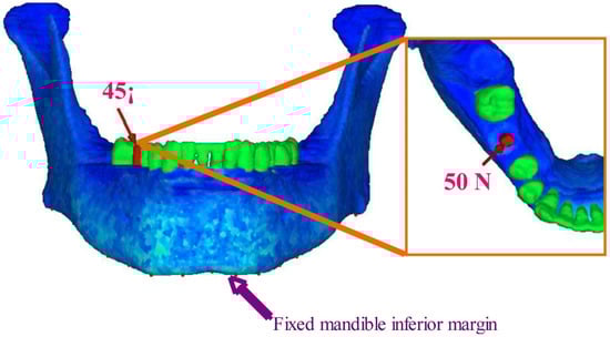Geometrical and boundary conditions. A buccolingual force at a 45-degree oblique angle to the tooth axis was concentrated onto a single contact point, and static occlusal load of 50 N was applied to the premolar buccal cusp of teeth. Inferior border of the mandible was assumed to be fixed (Reproduced from Ref. [13]).