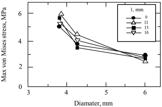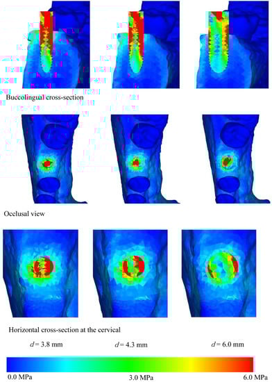 Figure 4, Figure 5, Figure 6 and Figure 7 show the equivalent stress for each implant type in a buccolingual cross-sectional view, occlusal view, and horizontal cross-sectional view at the neck of the implant. In all implants, high distribution of stress was found in the peri-implant bone surface on the buccal and lingual sides in the region of the neck. The maximum stress values for implant lengths of 9.0, 11.0, 13.0, and 16.0 mm were respectively approx. 6.0, 5.8, 5.3, 5.0 MPa for implant diameter 3.8 mm; 4.5, 4.0, 3.8, and 3.5 MPa for implant diameter 4.3 mm; and 3.2, 3.0, 2.8, and 2.5 MPa for implant diameter 6.0 mm. The maximum equivalent stress values in the peri-implant bone are shown in Figure 8. The results show that the equivalent stress values on the peri-implant bone tend to decrease with increasing length and diameter of the implant.