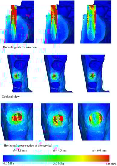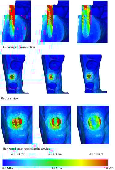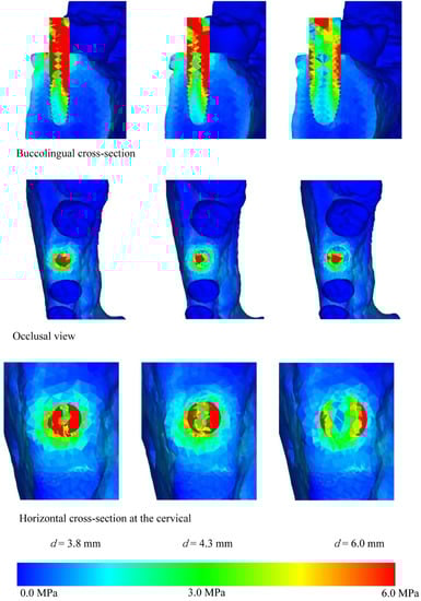 The buccolingual cross-sectional view showed equivalent stress in the peri-implant bone surface on the buccal side. The equivalent stress was approximately 3.0–6.0 MPa with implant diameter of 3.8 mm, 3.0–4.5 MPa with implant diameter of 4.3 mm, and 1.0–3.0 MPa with implant diameter of 6.0 mm. The occlusal view of the implant and the horizontal cross-section at the cervical region show concentration of the stress in the peri-implant bone, and this is particularly high on the buccal side. With the buccolingual cross-section, equivalent stress values tend to decrease in the same way with increasing diameter and length of the implant. In the implant, equivalent stress was found from near the load-bearing site toward the base of the implant, and the equivalent stress decreased with increasing length and diameter of the implant. The stress distribution was such that stress appeared in peri-implant bone but tended to decrease in the central and lower regions.