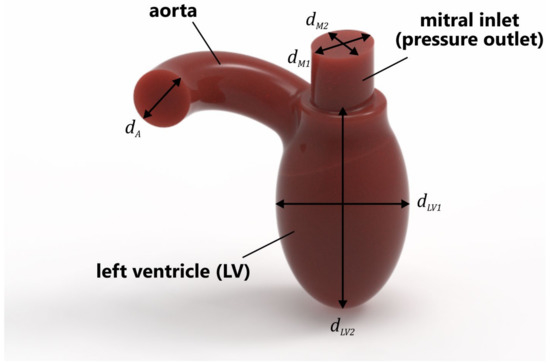 In this study, a simplified model of the LV was used (Figure 1). The volume of the ventricle was 87 mL, which was assumed to be the average of the diastolic peak volume (118 mL) and end-systolic volume (56 mL) [20]. The geometrical parameters of the LV were as follows: = 24 mm, = 20 mm, = 20 mm, = 45 mm, and = 76.5 mm. In the simulations, only the systolic phase was considered, i.e., the mitral valve was fully closed, and flow occurred only through the PVL. This caused blood to flow backward into the left atrium; in our case, into the mitral inlet (pressure outlet), which also imitated the LA in this study.