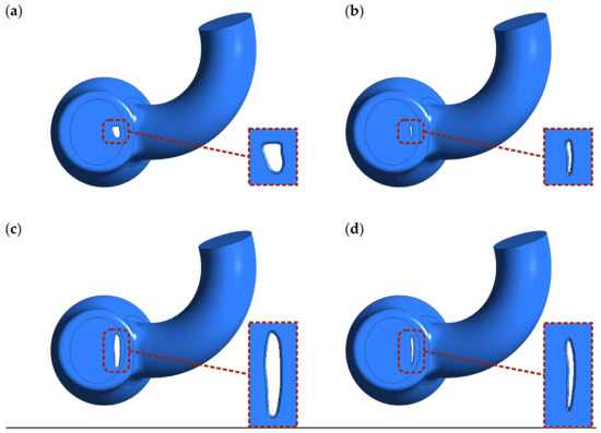 Four different PVL geometries were studied in this work, as shown in Figure 2. The main characteristics differentiating the geometries were the cross-sectional area (CSA) and shape. The studied geometries were generated based on the imaging data [8,35,36,37], and could be considered as representative of clinical cases of real-life PVLs. The wide channels (Figure 2a,c) were created to reproduce untreated PVLs, while the narrower channels (Figure 2b,d) were meant to represent PVLs that were not fully closed after the percutaneous closure. Hereafter, the different cases are referred to as PVL I, PVL II, PVL III, and PVL IV with CSAs of 7.9, 1.5, 18.5, and 5.0 mm2, respectively. The height of each channel was 3 mm. PVL walls were perpendicular to the upper wall of the LV, and their connection was rounded; the radius was equal to 0.3 mm. Vertical cross-sections of the analyzed geometries were presented in Figures 7 and 10, while the overall shape was more clearly visible in Figure 8.