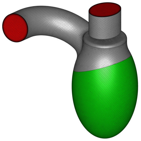 To represent LV motion, the most obvious solution was to use a dynamic/deforming mesh. Unfortunately, the preparation phase was a complex and time-consuming process, not to mention the increased computation time that made such a solution impractical in day-to-day medical diagnostics. For this reason, a different approach was used—instead of describing the exact wall movement, flow characteristics (induced mass flux) over time were described using a mathematical expression [20]. Equivalent boundary conditions were applied in the computations: a mass flow inlet condition for the LV side wall and a pressure outlet condition for both the aortic and mitral outlets (Figure 4). The blood flow rate profile varied over time and was defined as a user defined function. The mass flux was delivered through the side wall of the left ventricle (green surface in Figure 4). The stream was distributed evenly on the whole surface and the inlet condition was set as “normal to boundary” (at each facet).