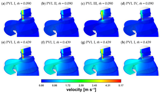 Contours of velocity magnitude inside PVLs at = 0.090 kg s−1.