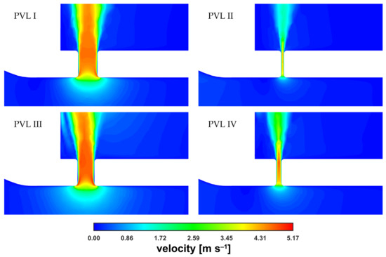 The velocity magnitude distribution along the PVL axis showed a rapid increase just past the channel entrance. The evolution of the velocity profile was visible (with the transition to a fully developed profile), reaching maximum values of approximately 5 m s−1. The profile was rather typical for a duct flow, and observed irregularities in the velocity distribution, i.e., a noticeable asymmetry, could be attributed to the transient nature of the flow. To better show the small differences in maximum velocities, the characteristic values in the channel were listed in Table 2. In the table, was the velocity at the exact center point (both horizontally and vertically) of the PVL section seen in Figure 7, and was the mass-weighted average velocity over the entire PVL volume (PVL volumes were listed in Table A1 in the Appendix A).