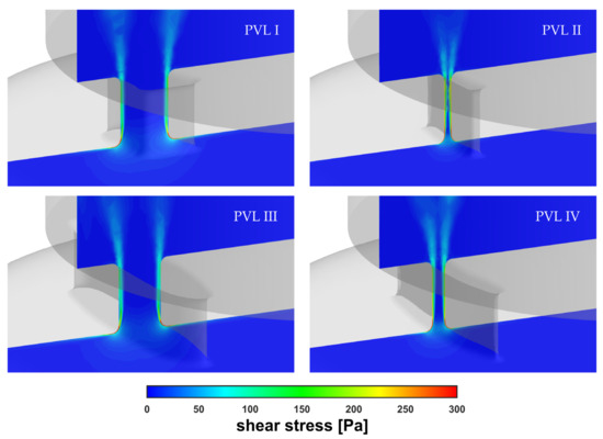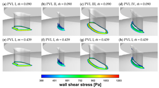 Contours of shear stress inside PVLs at = 0.439 kg s−1.