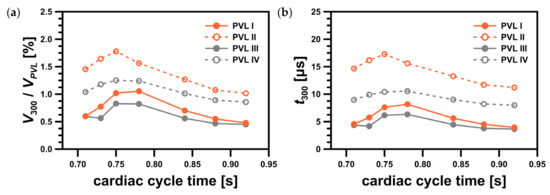 The safe level was exceeded only in a small area around the channel entrance for all studied PVL geometries, making the shape of the channel entrance another key factor affecting the probability of hemolysis. The maximum wall shear stress values, presented in Figure 9a, tended to increase in the acceleration phase of LV contraction and to decrease in the deceleration phase. Moreover, the maximum wall shear stress was higher at the beginning of the systole. This was related to the more rapid change in the blood flow rate in the first 0.1 s of the systole—in the profile used, it took 0.1 s to reach maximum flow rate (0.439 kg s−1), and then 0.2 s until the flow stopped. The shear stress magnitude inside the channel (Figure 9b) showed similar tendencies, with slightly smaller values than those at the channel walls. However, this observation was expected, since shear stress decreased away from the walls. Higher shear stress values obtained for PVL I and PVL III could be observed, and this may indicate that wider channels were more prone to hemolysis. The exact values presented in Figure 9 were listed in Appendix A in Table A1.