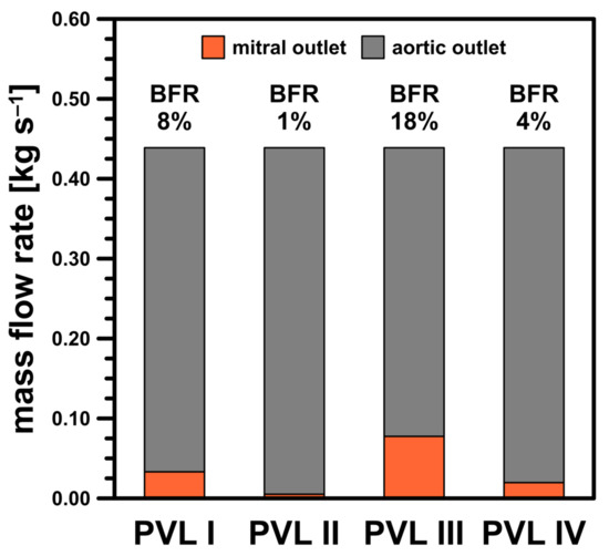 Finally, the mass balance in the LV should be addressed. Figure 12 presented the mass balance at = 0.439 kg s−1 as the combined mass flow rates through both the aortic and mitral pressure outlets. Here, an auxiliary parameter, the backflow ratio (BFR), was defined as the ratio of the flow at the mitral outlet to that at the inlet stream. As the CSA increased, the BFR values increased, as expected, due to higher flow resistance in the channel at high flow rates (Figure 5). This was another risk factor regarding severity of PVL condition, i.e., the higher the BFR, the higher the severity. However, since the present results were obtained using average pressure values at the outlets, the obtained values should be considered as illustrative only. This ultimately leads to the conclusion that a complete description of a PVL-affected cardiac cycle with more accurate BFRs requires further, more comprehensive analysis, as previously mentioned in this section.