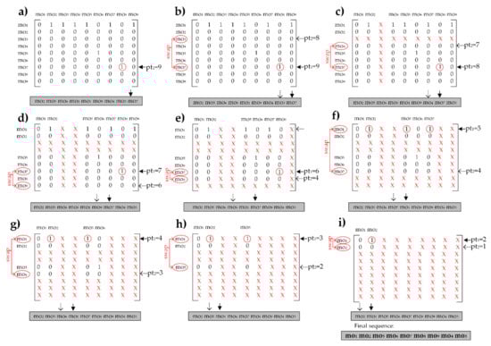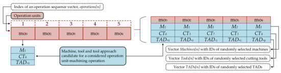 In Figure 1, we have the total of 5 operation units that match the permutation of 5 numbers. They are shown in the dashed boxes in the first row of the represented process plan (left picture). Position 1 in the vector contains the operation unit 3 which further include M1—machine 1, CT6—cutting tool 6 and TAD+x—TAD “+x” as candidates for mo3—machining operation 3. All these machining operations form an operation sequence vector called operations[n] (n is a total number of machining operations). Candidate solutions are assigned to each machining operation and presented in the right picture. Therefore, randomly selected candidates form machine vector, cutting tool vector and TADs vector, respectively.