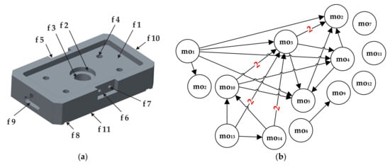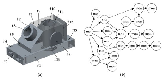 In order to represent aforementioned constraints and relationships, we adopted the first part from Guo et al. [42]. Its 3D solid model with assigned features and operations, as well as the cOPG that depicts only hard constraints, are shown in Figure 3. According to this figure, the total number of machining operations for prismatic part 1 is 20 and can be defined as the set of machining operations [mo1, mo2, mo3,…, mo20]. Each machining operation from the cOPG is represented as a node while connections among these nodes are directed edges that show precedence relationships among them. An operation sequence that satisfies these precedence relationships is considered a feasible operation sequence.