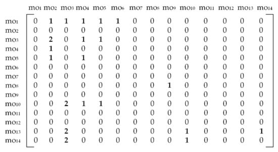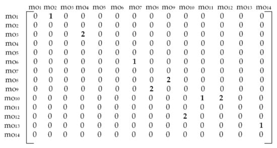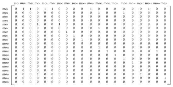 where P R i j stands for a precedence relationship between machining operation i (regarding the row) and machining operation j (regarding the column). For hard constraints only, the P R i j values are binary, ones and zeroes. The first rule for this case is when P R i j = 1 and   P R j i = 0 . Here, a directed edge connects the nodes m o i and m o j pointing from mo i towards mo j and, therefore states that machining operation i has to be performed prior to machining operation j. Otherwise, P R i j = 0 . Another rule is where P R i i = 0 for all operations from the operation set (here [mo1,…, mo20]). The expression n × n means that the adjacency matrix is a square matrix where n stands for the total number of machining operations.