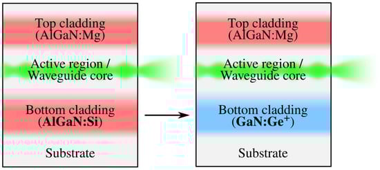 A first step in testing the use of heavy doping to lower the refractive index of GaN layers was accomplished in our group by doping GaN layers with oxygen at a level of 2 to [,,]. The layers were grown with the high nitrogen pressure solution (HNPS) growth method [] on a GaN substrate. Such a layer was then used as part of the lower cladding of a blue laser diode that showed no mode leakage into the substrate, despite the use of just a modest amount of aluminium in the remaining part of the lower cladding. This experiment demonstrated the potential of the doping technique. However, the heavily doped layer was grown in a different reactor than the rest of the laser structure, complicating the production process.