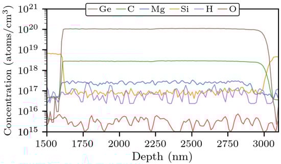 The germanium concentration of the layer is assessed on the base of secondary-ion mass spectrometry (SIMS) measurements, performed on a separate sample (Sample ), where a germanium-doped layer was grown in the same conditions as above, except for the temperature, which was 5 °C higher. In Sample , the concentration was determined to be between 1.0 and (Figure 2). As germanium incorporation is quite sensitive to temperature and more efficient at lower temperature [], we take as a lower bound for the germanium concentration in Sample . The SIMS measurement also evidenced that the layer contains carbon impurities at a concentration of , which is expected, given the growth conditions employed, especially the low pressure [] and low ammonia flow []. Anyway, since the carbon concentration is almost two orders of magnitude lower than germanium, no significant doping compensation should occur.