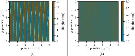The surface of Sample was examined by atomic-force microscopy (AFM). The resulting scan is shown in Figure 3a. The surface was mostly free of V-pits [,]; however, a high degree of step bunching [,] led to the formation of macrosteps of an average height of 13 nm, leading to a roughness of . Convinced that the macrosteps would needlessly complicate our reflectometry and ellipsometry measurements, we opted to remove about 15 nm of the layer with a silica-based chemical mechanical polishing (CMP) process, optimized to produce smooth surfaces ready for further epitaxial growth (similar to []). After cleaning in hydrofluoric acid and piranha solution, AFM scans of the resulting surface do not show any steps (Figure 3b), and the roughness is reduced to .