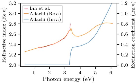To apply this model, the refractive index of each layer must be made explicit. Since the GaN substrate is not heavily doped, its refractive index (a function of energy) is assumed to be equal in to what is reportedthe literature for undoped GaN [,]; the real and imaginary parts of the refractive index are shown in Figure 4, as a function of photon energy. As we see, two different sources show good agreement, which builds confidence about their accuracy. In this work, we used the data from Adachi [], since they were measured across a larger range of energies.