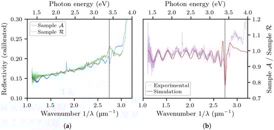 The reflectivity spectra of sample and (a) and their ratio with the simulation superimposed (b). The vertical line marks the bandgap energy of undoped GaN.