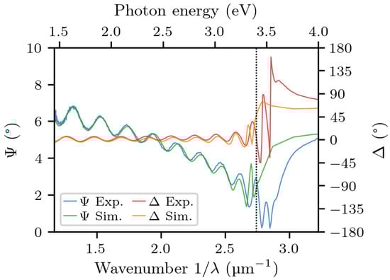The ellipsometric parameters and of sample , as a function of wavenumber, with the simulation superimposed. The vertical line marks the bandgap energy of undoped GaN.