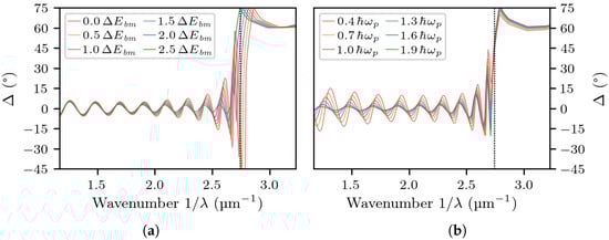 As we have determined, by adjusting the fitting parameters and manually, both have a clear effect on the amplitude of the Fabry–Pérot oscillations for both reflectometry and ellipsometry (both and ). An increase of results in wider oscillations at energies close to the bandgap (Figure 7a), whereas an increase of results in wider oscillations at energies farther away from the bandgap (Figure 7b). Neither of the two parameters change the period or the vertical position of the oscillations very much, as those are primarily affected by the thickness of the heavily-doped layer and incidence angle , respectively. In effect, the fitting procedure computes the values that best match the amplitude of the oscillations in the whole energy range up to the bandgap. In all cases, we deem the fits satisfactory.
