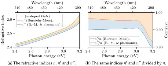 The refractive index n of undoped GaN (from []), as well as the decrease caused by the Burstein–Moss (orange area) and plasmonic effects (blue area), leading to the modified indices and (calculated from our model using the fitting parameters from ellipsometry: eV, eV).