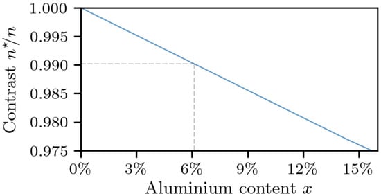 Specifically, at the wavelength of 450 nm, which we consider of most practical interest, the refractive-index contrast between heavily doped and undoped GaN is determined to be for reflectometry and for ellipsometry. While the resulting values between the measurement techniques are not overly different, we consider ellipsometry to be more accurate. According to similar ellipsometry-based measurements previously performed by others [], a contrast of corresponds to that between AlGaN and GaN, where the aluminium content x is (Figure 9), meaning that layers doped with germanium, at a level of , can seamlessly replace undoped (or moderately-doped) AlGaN layers in nitride-based laser structures, with no change of the refractive index profile.