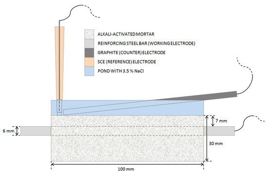 Three parallel specimens were prepared for each mortar mix for the corrosion tests. Specimens were cast in 3 cm × 3 cm × 10 cm prism-shaped molds. A cold, ribbed type B 500B reinforcing steel bar (1.0439 [43]) of Φ6 mm diameter was embedded into each specimen. Each end of the steel bar was protected with an epoxy-based coating such that a 9 cm length in the middle was left unprotected and a surface area of 17 cm2 was exposed to the mortar. The steel bar was covered with 7 mm of mortar. After casting, the specimens were cured in a humidity chamber for 28 days. Following curing, the specimens were exposed to 3.5% NaCl solution from the pool on the top of each specimen for 17 weeks of wet/dry cycles. Each cycle was one week long, consisting of 3 days wetting, followed by 4 days drying. One week of exposure corresponds to one wet/dry cycle; weeks of exposure are marked as W1 (first week) to W17 (last week).