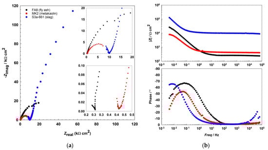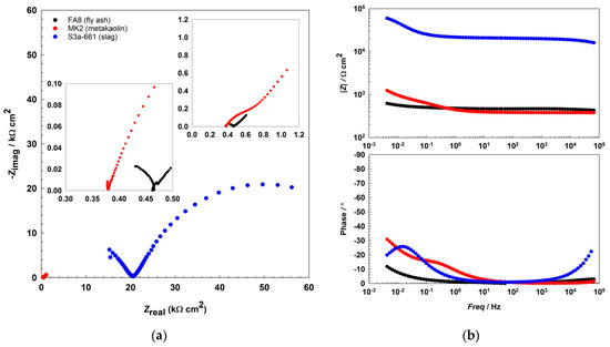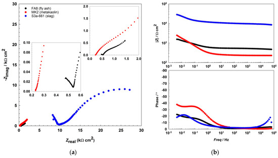 Representative EIS spectra, (a) Nyquist, and (b) Bode plots recorded during the 17th wetting/drying cycle in each of the three different alkali-activated mortars.