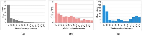 The corrosion processes intensify as the time of exposure increases, while the total impedance (|Zittel) values decrease over time (Figure 5); corrosion rates (νcorr) consequently increase over time (Table 2). This is expected as a result of the increase in Cl− concentration in the mortar following each cyclic wetting with the 3.5% NaCl solution. The measured rise in νcorr is especially high in the FA8 mortar (Figure 5a), where values gradually increase from 12 μm/year in the 1st wetting/drying cycle to 270 μm/year in the 8th cycle, and finally to 1510 μm/year in the 17th cycle. The equivalent measured increase in νcorr values is lower in the MK2 mortar (rising from an initial value of 38 μm/year to a final value of 340 μm/year after 17 cycles) but still significant (Figure 5b). On the contrary, the steel embedded in the S3a-661 mortar does not exhibit significant corrosion rates after 17 cycles of exposure, with the νcorr reaching 8 μm/year. However, the |Z|total values measured on the steel in the S3a-661 mortar do not decrease evenly (Figure 5c), with the highest corrosion rate (35 μm/year) measured during the 11th week of exposure (W11).