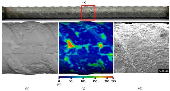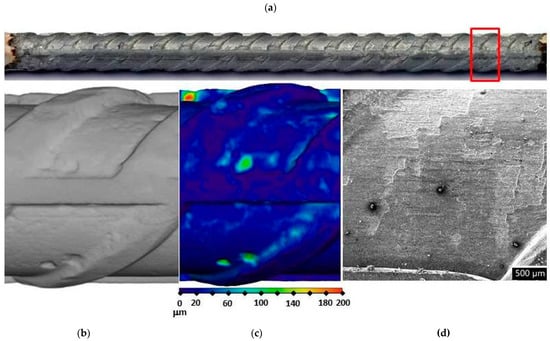 Visual assessment of the steel bar embedded in the S3a-661 mortar after 17 weeks of exposure; (a) photographic image of the steel bar; (b,c) μXCT images of the most severe corrosion damage; (d) SEM image of the representative steel surface (magnitude 35×).