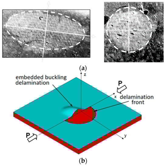 Delaminations: (a) white spots indicate the disbonds of the adjacent reinforcement layers which can buckle under compressive loading and propagate; (b) cross-section in the xz plane of an embedded buckling circular delamination under compressive loading.