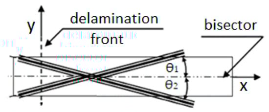 Arrangement of the reinforcement in the adjacent layers undergoing separation due to the delamination propagation. Relative orientation θ = θ1 + θ2 (θ1 = θ2) is referred to as interfacial ply orientation. Angles θ1 and θ2 can be measured relative to the specimen x-axis. The θ1 can be considered as an angle of reinforcement below the delamination plane, and θ2 can be considered as an angle of reinforcement above the delamination plane.