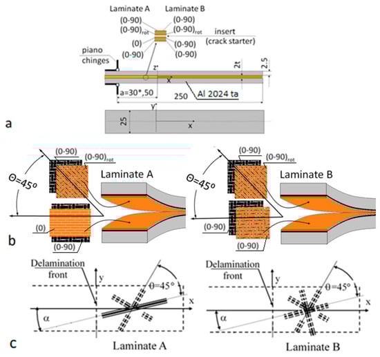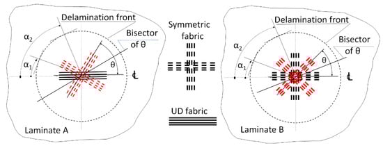 Two laminates designated A and B were considered, as shown in Figure 4. Laminate A was composed of UD and symmetric fabric (2 × 2 twill), and θ = 45°. Laminate B was composed of symmetric fabrics only, but as in the previous case, θ = 45°. The laminates were tested for Ψ = 0° (Mode I), Ψ = 30°, 60° (Mixed Mode I/II), and for Ψ = 90° (Mode II) where Ψ was the phase angle (1).