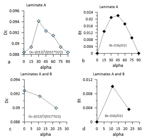 Dc and Bt coefficient calculated for the used hybrid beam specimens. (a,b) The lower branches of the specimen representing Laminate A; (c,d) upper branches of the specimens representing Laminates A and B.