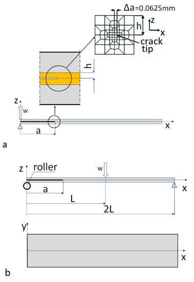 Modeled structures: (a) Mode I test; (b) Mode II test. Mesh design in the vicinity of the delamination front is shown in the xz plane. It was the same for both models. The h dimension represents the thickness of two reinforcement layers.