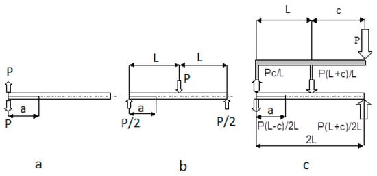 The major problem appearing in the intended tests and the beam specimens that had to be used was the inevitable lack of symmetry in xz and xy planes of the specimens and resulting deformation and stress–strain couplings, causing undesired loading modes. For example, in the case of DCB (Mode I) tests, the lack of symmetry in the xy plane results in an unwanted Mode II loading component, and the lack of symmetry in the xz plane results in coupling between normal stress and shear strain, inducing a Mode III component. One should notice that for the ENF test, a pure Mode II condition never occurs over the whole front length, even if specimens are perfectly symmetric, since the GIII component is always present next to the sides of a beam. Unfortunately, the complete removal of the mentioned couplings is not possible. Nevertheless, they can be reduced by modifying the design of the specimen, e.g., by making the investigated laminates thin and backing them with much thicker and stiffer isotropic metal strips, as shown in Figure 4 [23] or by selecting a particular layup design resulting in a quasi-isotropic laminate [9,29]. In the case of the presented research, the former was chosen because the latter would result in too high specimen stiffness due to the large number of reinforcement layers needed to produce sufficiently quasi-isotropic laminate; furthermore, the fabrication of such specimens would be more laborious.