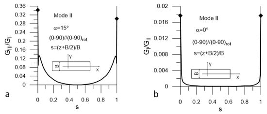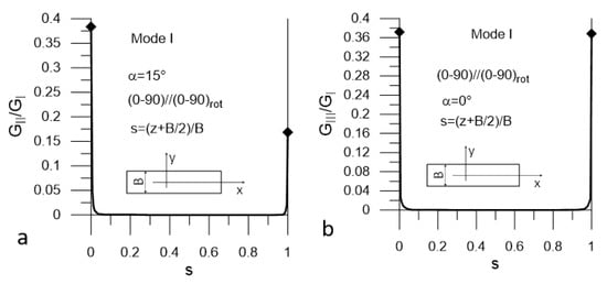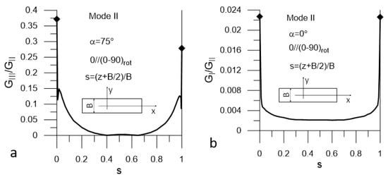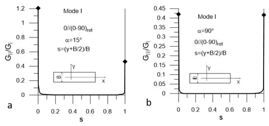 The presented plots are limited to these corresponding to the most unfavorable values of α = αuf. The plots in Figure 8 and Figure 9 present distributions of GII/GI and GIII/GI ratios for Mode I loading (DCB test) for Laminate A and Lamianta B, respectively. The plots in Figure 10 and Figure 11 present distributions of GI/GII and GIII/GII ratios for Mode II loading (ENF test) for Laminate A and Laminate B, respectively. Under Mode I loading, for both laminates, the GII and GIII components were present. In the case of Laminate A, the maximum contribution of GII corresponded to αuf = 15° and the maximum contribution of GIII corresponded to αuf = 90°; see Figure 8. For Laminate B, the maximum contribution of GII corresponded to αuf = 15° and the maximum contribution of GIII corresponded to αuf = 0°, as shown in Figure 9. Under Mode II loading, components GI and GIII were present. For Laminate A, the maximum contribution of GI occurred for αuf = 0° and that of GIII occurred for αuf = 75°, as shown in Figure 10. For Laminate B, the maximum contribution of GI occurred for αuf = 0° and of GIII for αuf = 15°, as shown in Figure 11.