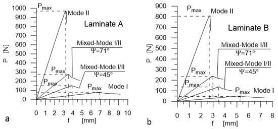 Typical load–displacement plots corresponding to Mode I, Mode II, and Mixed-Mode I/II (Ψ = 45° and 71°) loadings are shown in Figure 12. The most important experimental results are presented in Figure 13 and Figure 14 for Laminate A, and for Laminate B, they are presented in Figure 15 and Figure 16. The whiskers limit extremes of the results of each test, the middle bars represent the mean values, and the boxes represent the standard deviations.